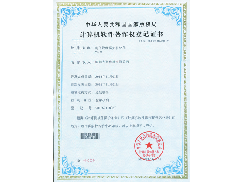 中華人民共和國國家版權局 計算機軟件著作權登記證書:電子織物強力機軟件V1.0(軟著登字第1297554號)